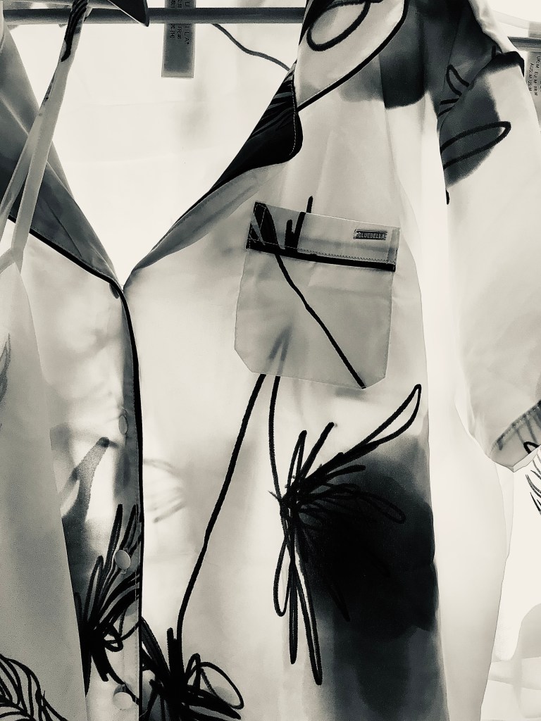 The Camille Short Pyjama Set in white consists of a short sleeved button-up shirt and a pair of shorts with an abstract black floral print on white polyester satin. The satin is opaque and fairly heavy, which gives this two-piece an over all luxurious feel, and it flows beautifully around the body.
